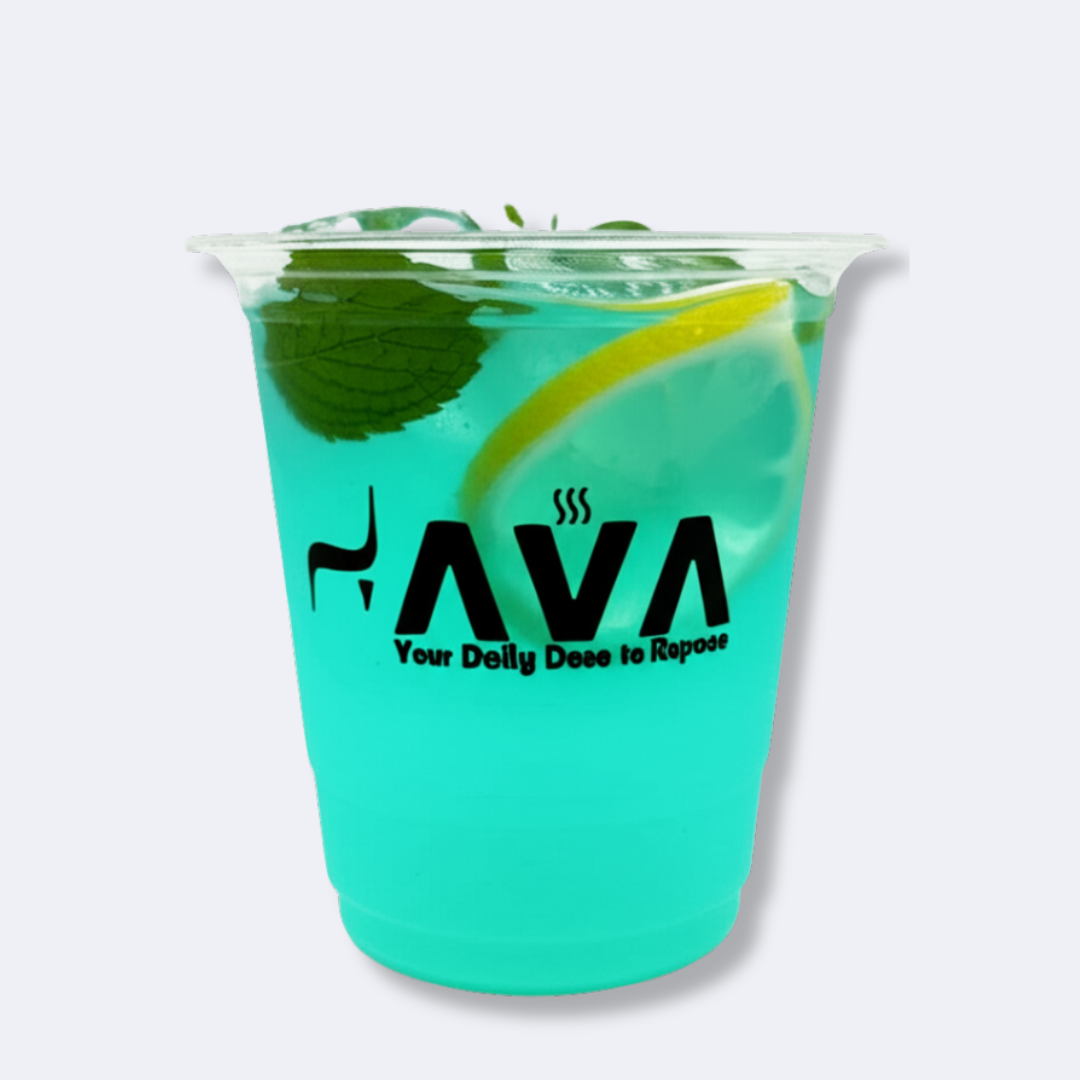 A mesmerizing blue lagoon in a glass! A refreshing blend of butterfly pea flower tea (for natural blue hue), lime, mint, and coconut syrup, topped with sparkling water. Garnished with edible blue flowers and lime slices for an oceanic vibe